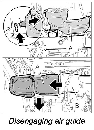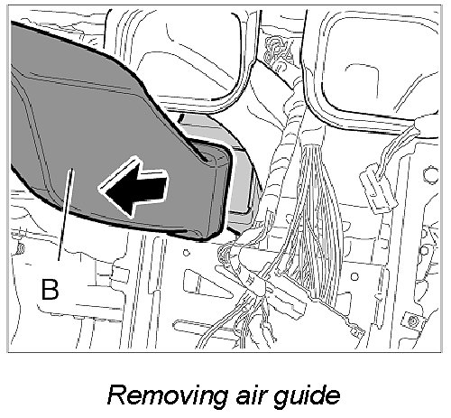 2. Pull the air guide -B- up out of the heater/air-conditioning unit.
