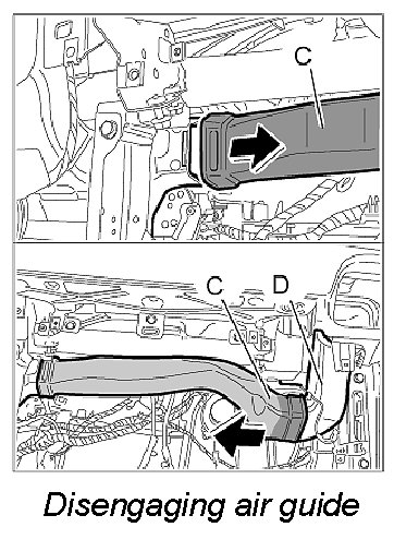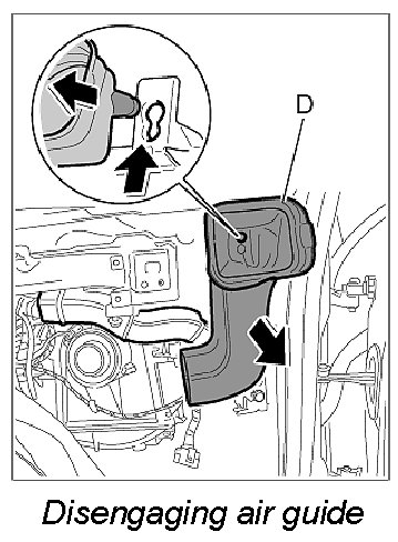 3. Disengage air guide -D- by pulling it upward at the mounting bracket, and pull it out in a downward direction to remove it.