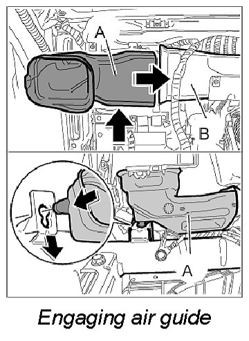 3. Slide the air guide -A- into the air guide slot -B- and engage air guide -A- at the mounting bracket.