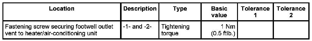 2. Screw the footwell outlet vent to the heater/air-conditioning unit with the two fastening screws at the left -1- and right -2-. - Tightening torque: 1 Nm (0.5 ftlb.)