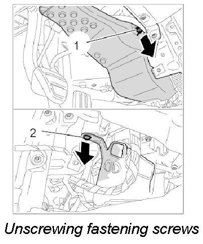 1. Unscrew the fastening screw at the left -1- and right -2- of the heater/air-conditioning unit.