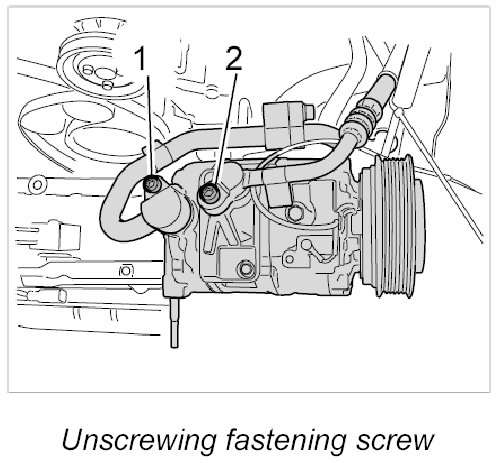 1. Unscrew the fastening screw -1- on the compressor.