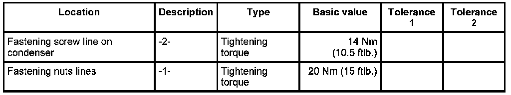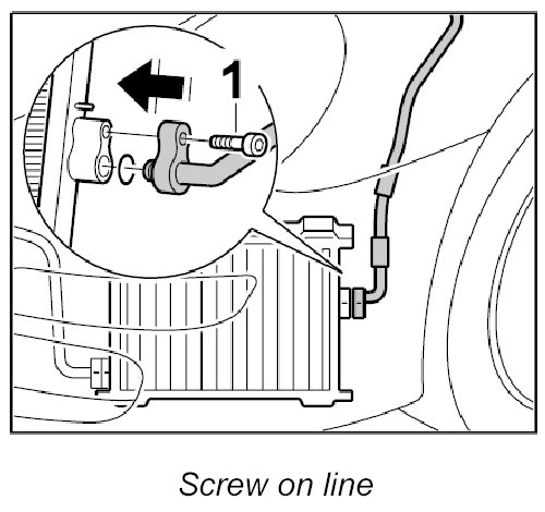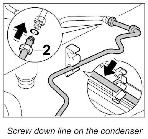2. Clip line into the line holder at the top, insert line into the condenser and screw down with -2- fastening screw. - Tightening torque: 14 Nm (10.5 ftlb.)
