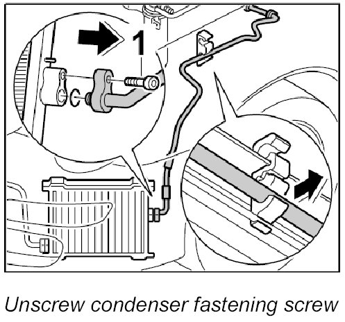 1. Unscrew the fastening screw -1- for the line condenser and pull the line out of the condenser.