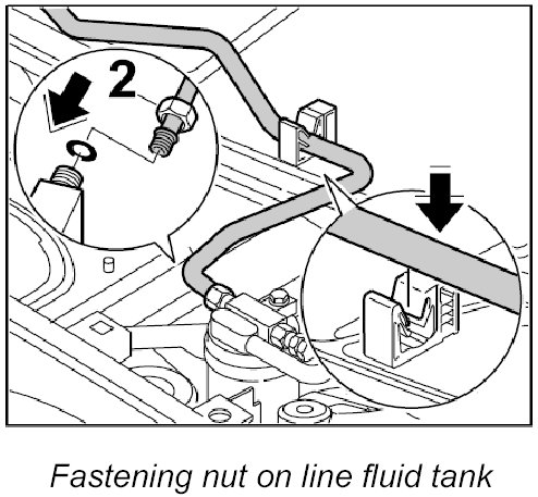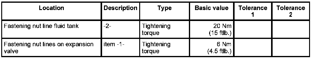 1. Lay the refrigerant line under the heat exchanger hoses and screw down on line to fluid tank -2- with fastening nut. - Tightening torque: 20 Nm (15 ftlb.)