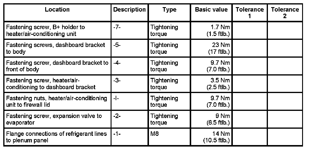 15. Screw down holder of heater/air-conditioning unit with the fastening screw -3-. - Tightening torque: 3.5 Nm (2.5 ftlb.)