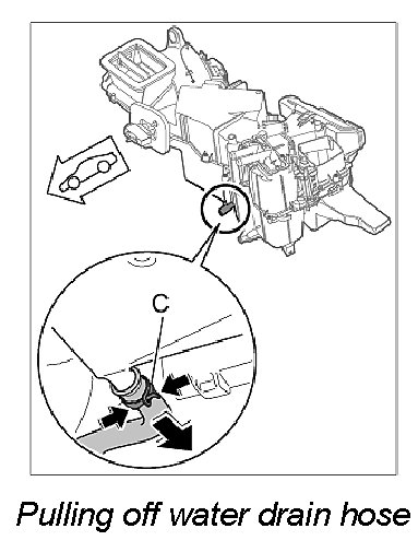 12. Lay down the air conditioner, release clamp for water drain hose -C- and pull off the water drain hose from the heater/air-conditioning unit.