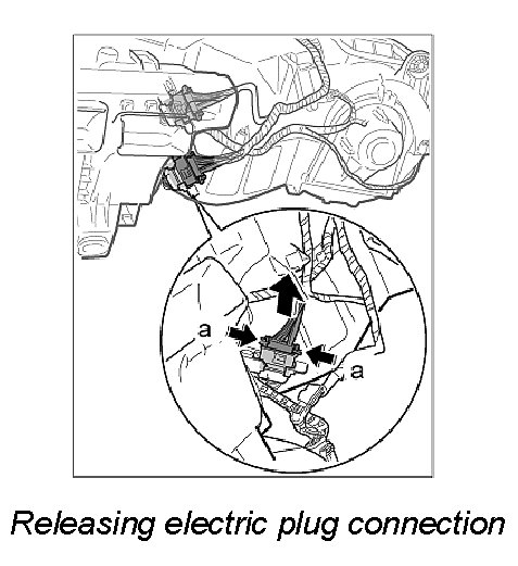 15. Release upper plug connection on heater/air-conditioning unit -a- and unplug.