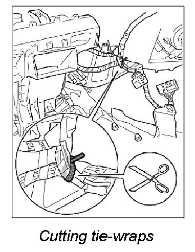 16. Cut tie-wraps of electric line (vehicle wire harness to heater/air-conditioning unit wire harness) with side cutters. Remove vehicle wire harness.