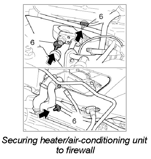 16. Slide the fastening bolts of the heater/air-conditioning unit through the firewall lid and tighten with the three fastening nuts -6-. - Tightening torque: 9.7 Nm (7.0 ftlb.)