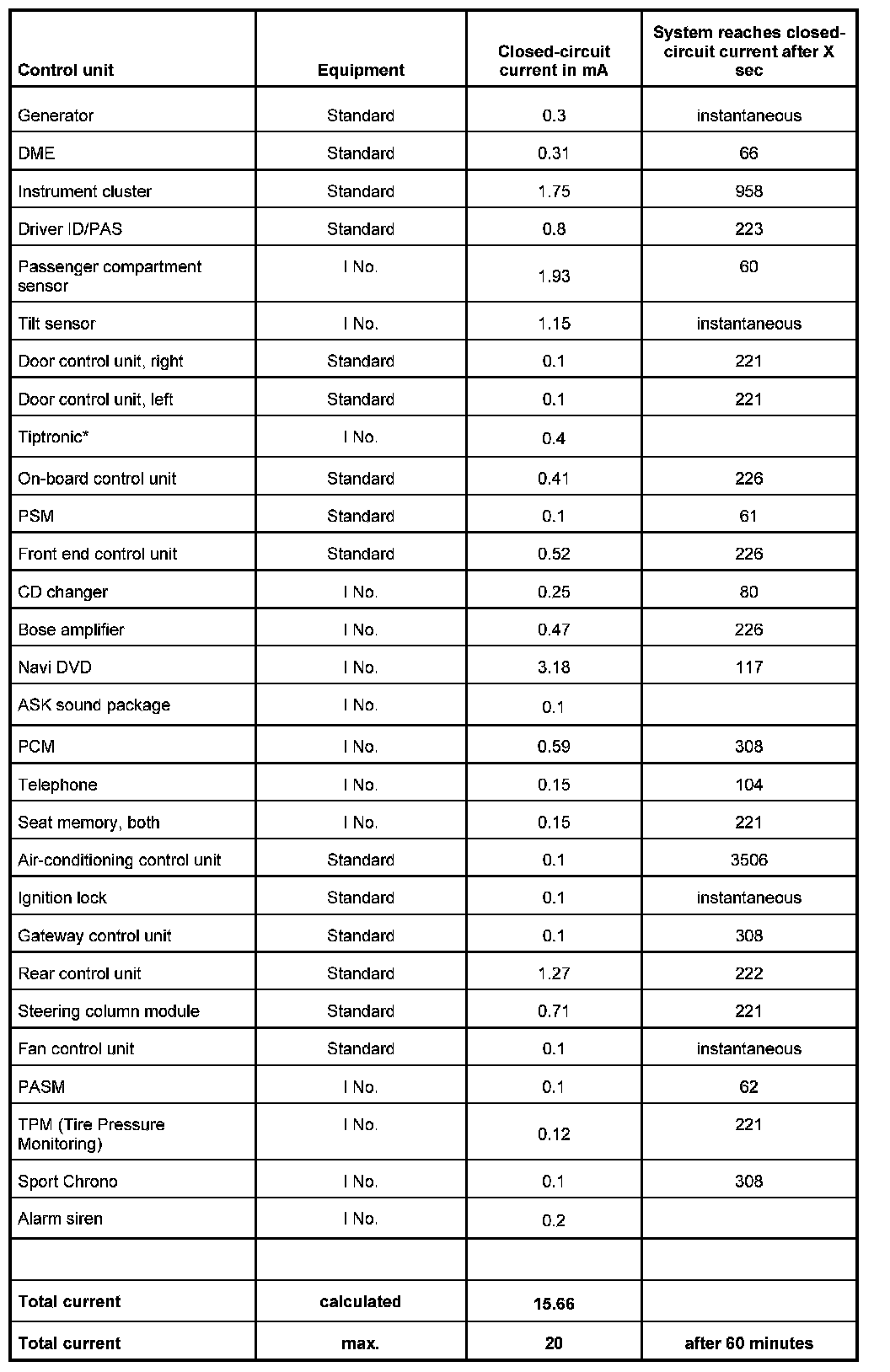 INFORMATION: Before measuring the closed-circuit current, determine the vehicle equipment (I numbers) and establish the expected closed-circuit current with the aid of the attached table.