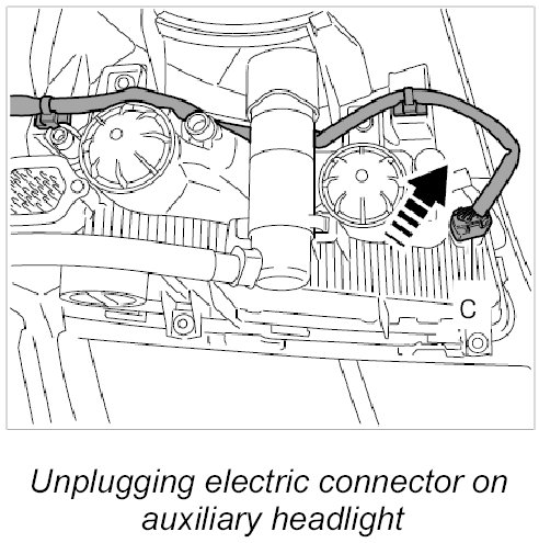 1. Release and unplug electric connector on the auxiliary headlight -C-.