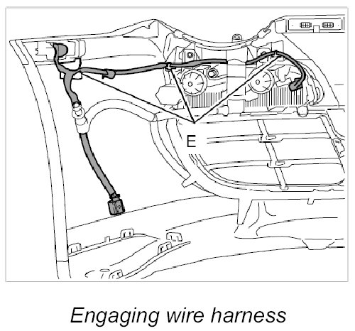 3. Disengage wire harness at the auxiliary headlight and at the front apron -E-.