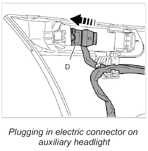 3. Plug in electric connector on the auxiliary headlight -D- until the connector engages securely and engage the wire harness on the auxiliary headlight.