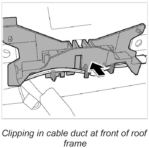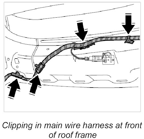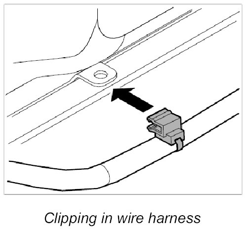 17. Clip in wire harness for end plate under windscreen at the three retaining clips -arrow-.