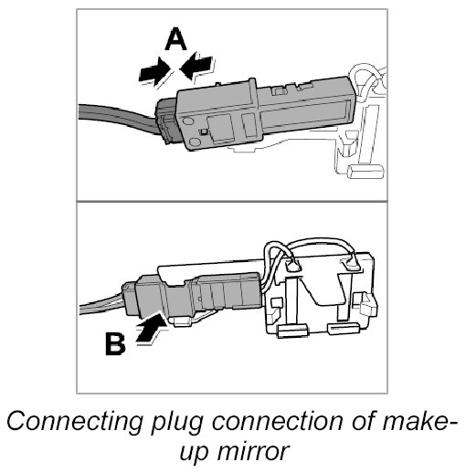 12. Connect plug connection of make-up mirror, left and right -87 and 88-.