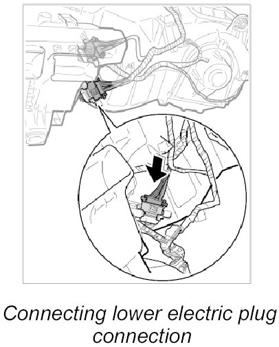 14.3. Push in lower electric plug connection at heater/air-conditioning unit until it is felt to engage.