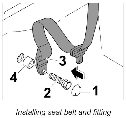 3.1. Tighten fastening screw -2-, seat belt with fitting -3- and spacer sleeve -4- on inner lower side member. - Tightening torque: 50 Nm (37 ftlb.)