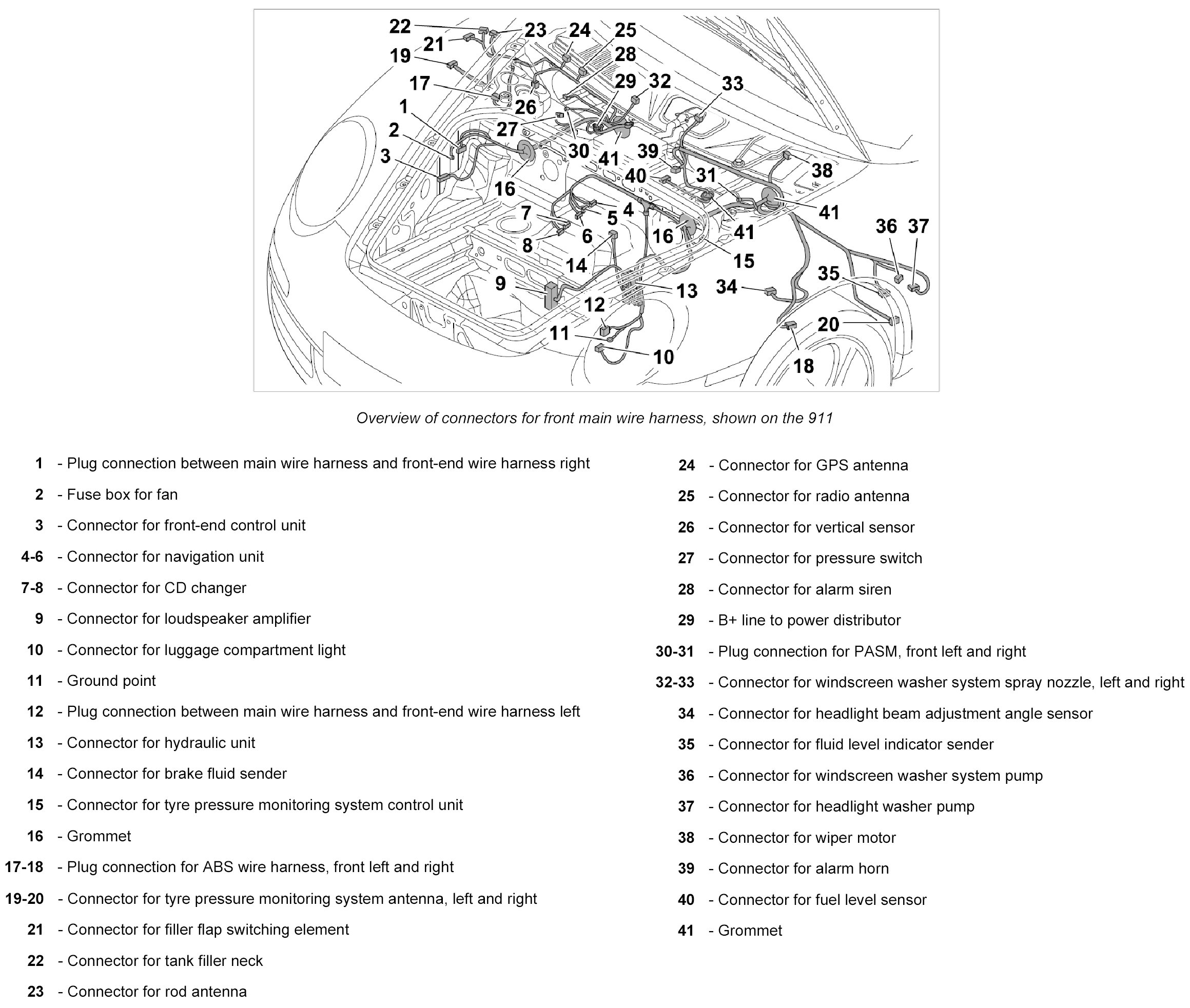 21. Push on connectors of front antenna for tyre pressure monitoring system -19 and 20- at left and right until they are felt to engage.