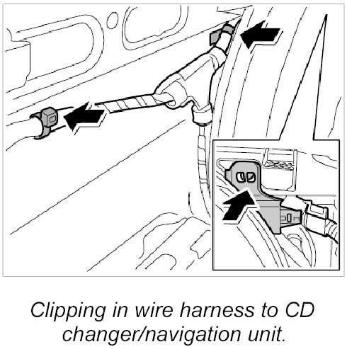 25. Clip in wire harness to CD changer/navigation unit -arrows-.