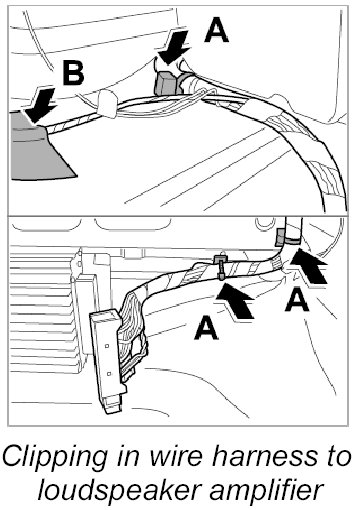 26. Clip in wire harness to loudspeaker amplifier -Arrows A- and fix with new adhesive tape -Arrow B-.