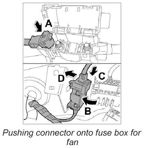33.1. Push connector onto fuse box for fan -Arrow A-.