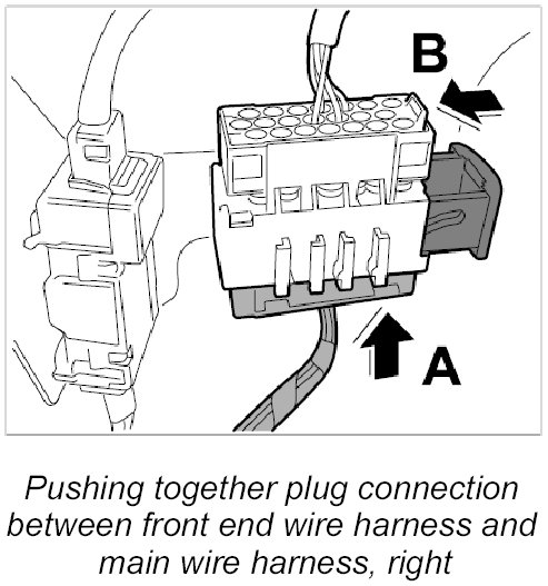 34.2. Push together plug connection between front-end wire harness and main wire-harness right -Arrow A- and lock -Arrow B-.