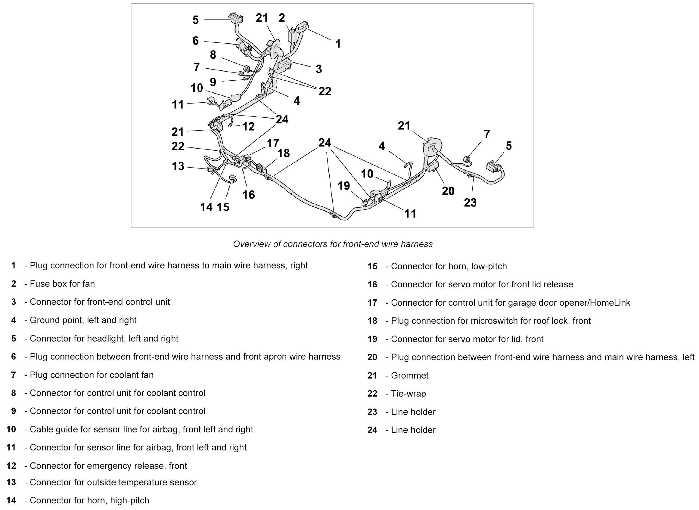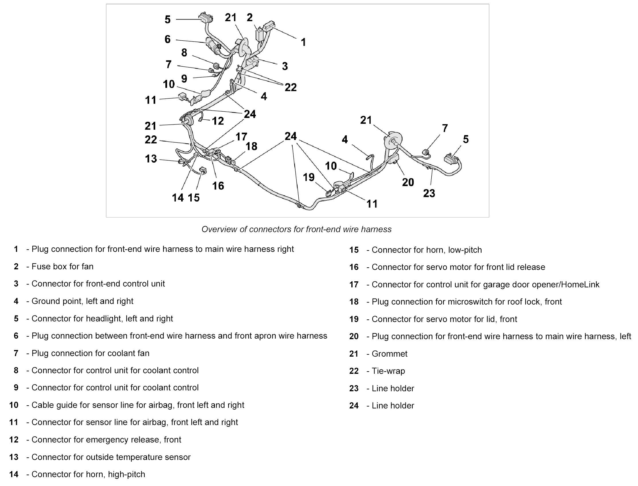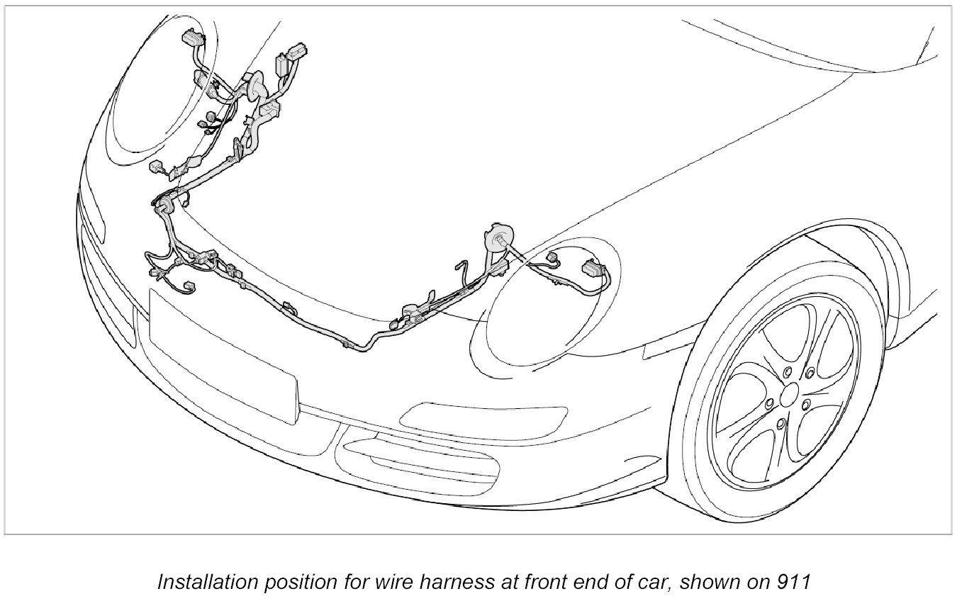 - The wire harness for front end spare parts scope means the scope for fully-equipped vehicles. Depending on the vehicle equipment, connectors not required are tied to the wire harness for front end using tie-wraps.