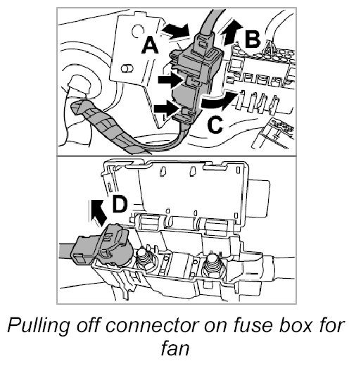 2.3. Pull off connector on fuse box for fan -arrow D-.