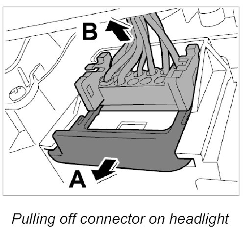 4.2. Pull off connector on headlight at left and right -arrow B-.