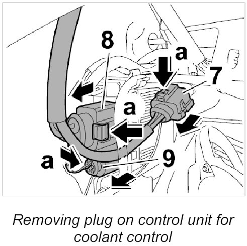 5. Pull off connector and plug connection on control unit for coolant control -7 to 9-.