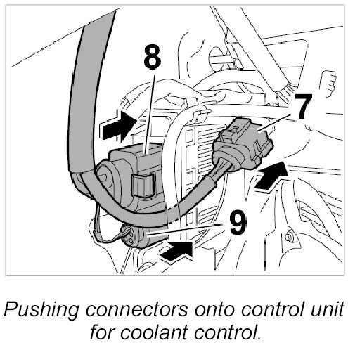 17.1. Push the two connectors onto the control unit for coolant control -8 and 9- until they engage securely.