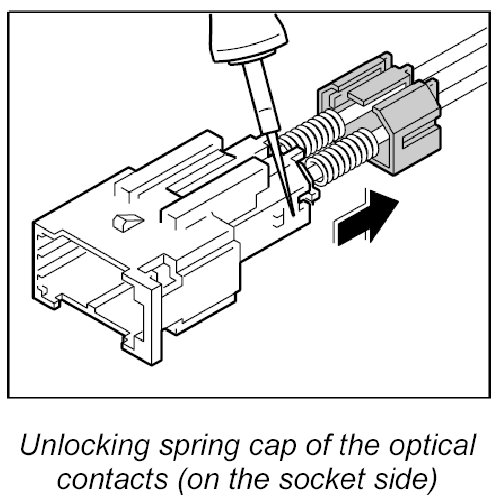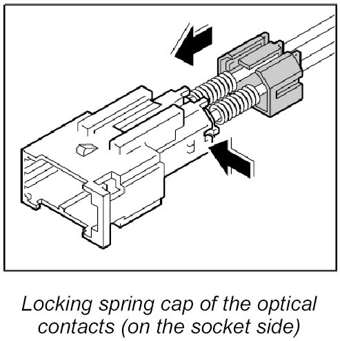 At a force of 10 N (7.5 lb.) the springs installed in the connection point will be compressed. This leads to an increase in attenuation, which could lead to system impairment and system failure. Therefore a maximum force of 10 N (7.5 lb.) may be used to pull on optical waveguides at connection points.