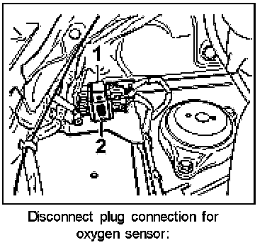 1. Disconnect plug connection in left of engine compartment for the oxygen sensor in front of catalytic converter. To do this, pull the black connector out of the holder first -2-.