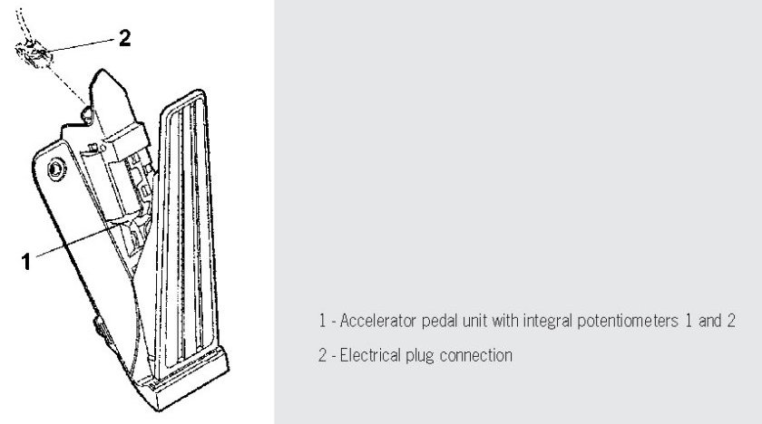 The accelerator pedal unit is also new. It was redesigned with the aim of reducing the individual components which in turn reduced the unit's weight by 60 % (approx. 600g). This was achieved through the integration of the potentiometers 1 and 2 into the accelerator pedal unit as well as through the elimination of the short throttle cable.