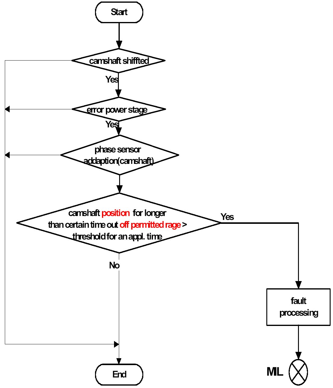 If the actual camshaft angle differs for a certain time to the desired camshaft position for a in a characteristic map specified range, a camshaft positioning (plausibility) fault will be stored.