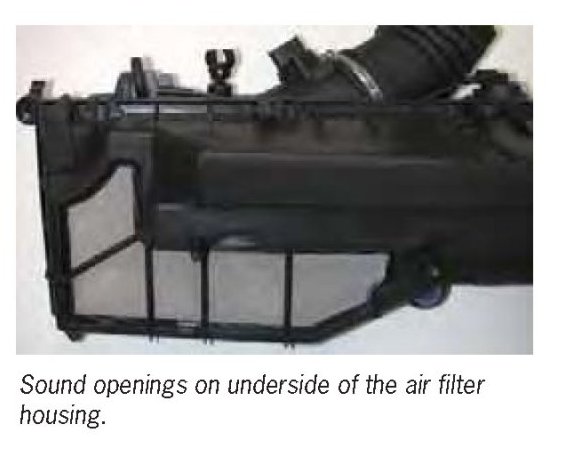 To avoid a possible intake of warm air from the engine compartment even under critical engine operating conditions (e.g. high ambient air temperature), the sound openings on the underside of the air filter housing have been modified. By using openings with a large surface area with inserted, almost airtight fabric, the intake of warm air from the engine compartment is nearly completely prevented while the intake sound typical for Porsche is retained.