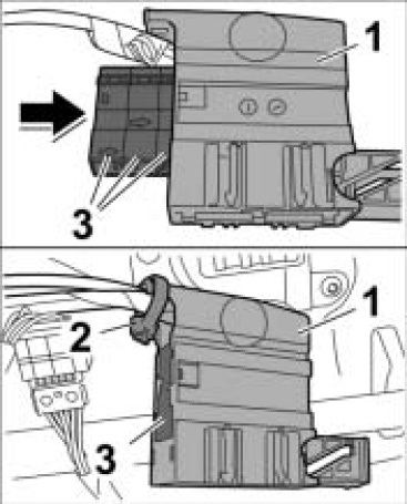 3. Press the three individual connectors -3- into the connector socket -1- until they engage firmly.