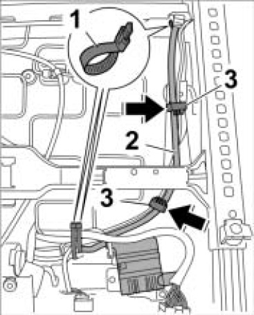 6. Place wire harness -2- into the two line holders -3- and secure with three new tie-wraps -1-.