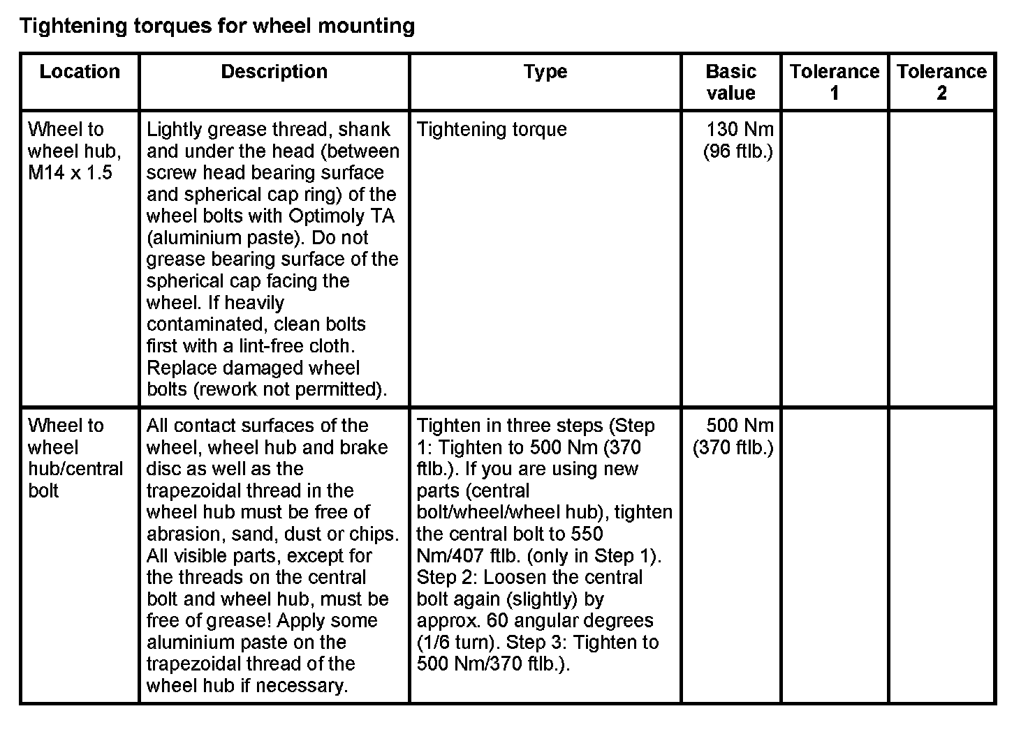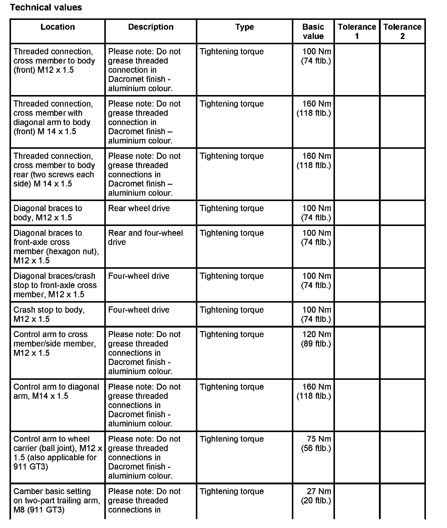 Tightening torques for front axle