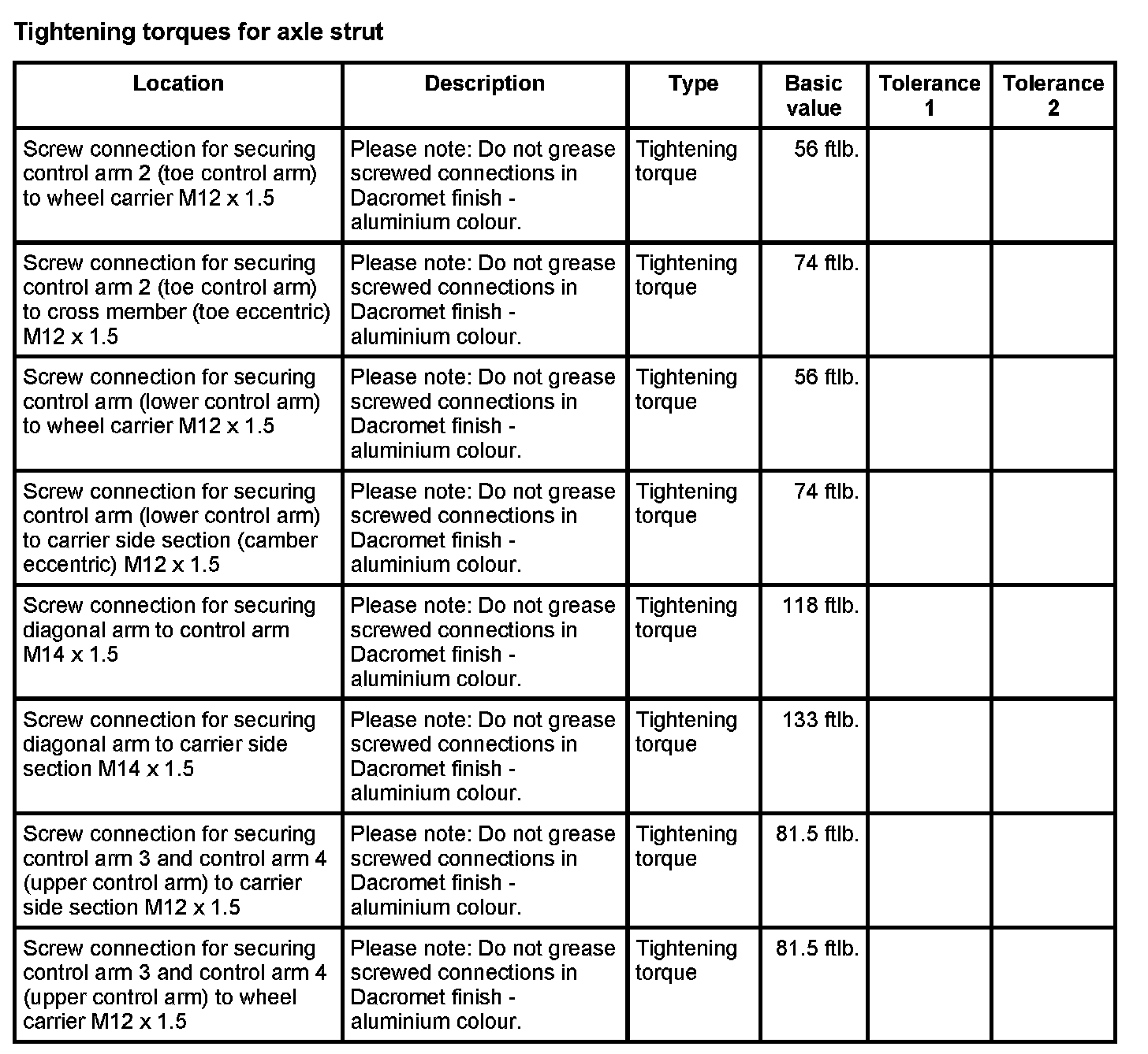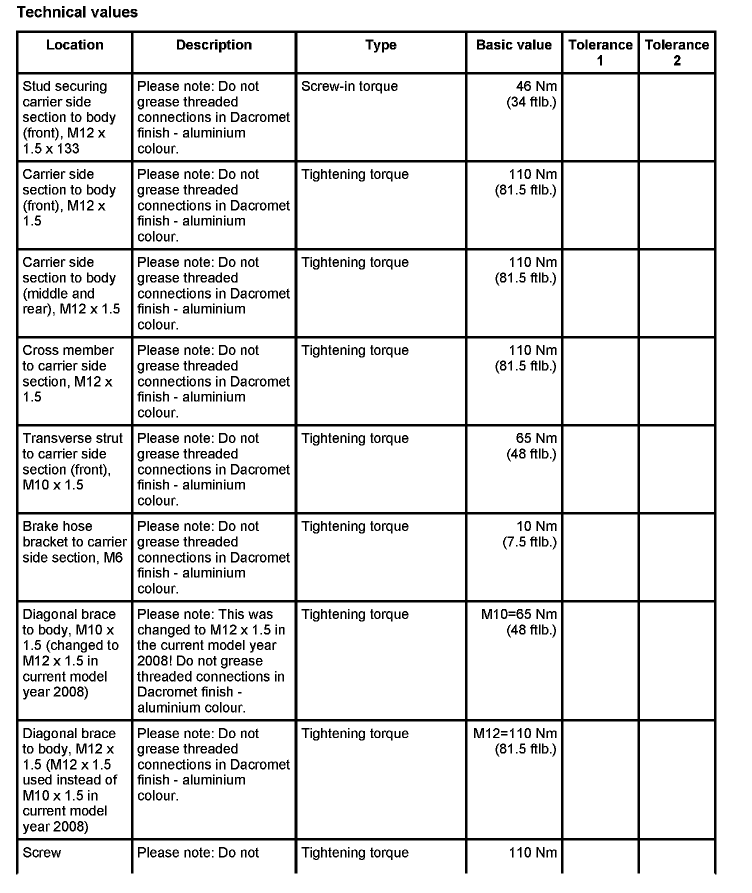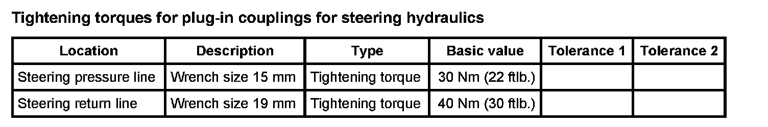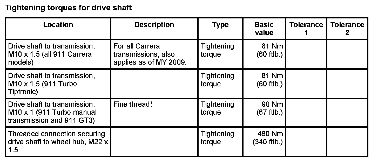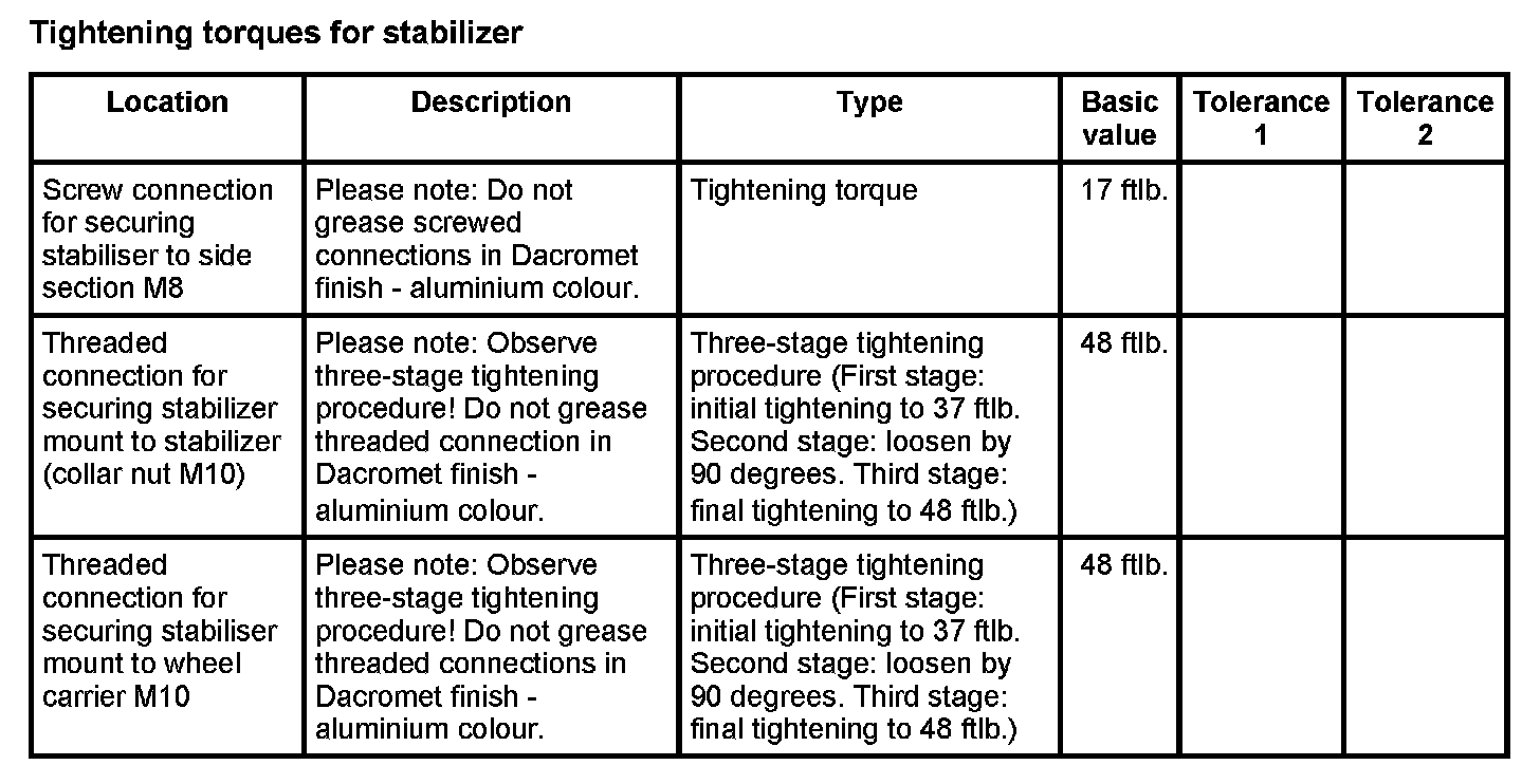 Tightening torques for rear axle