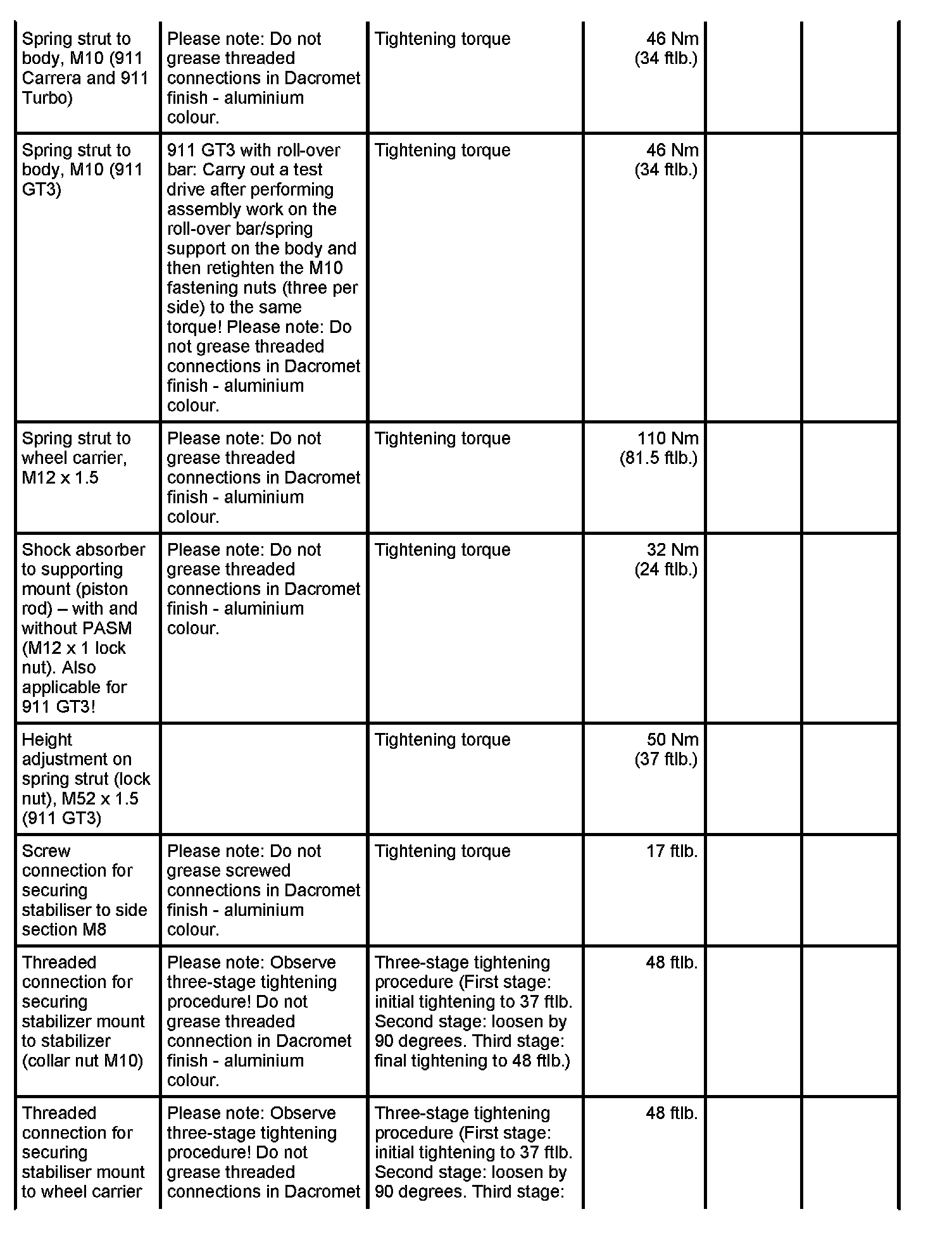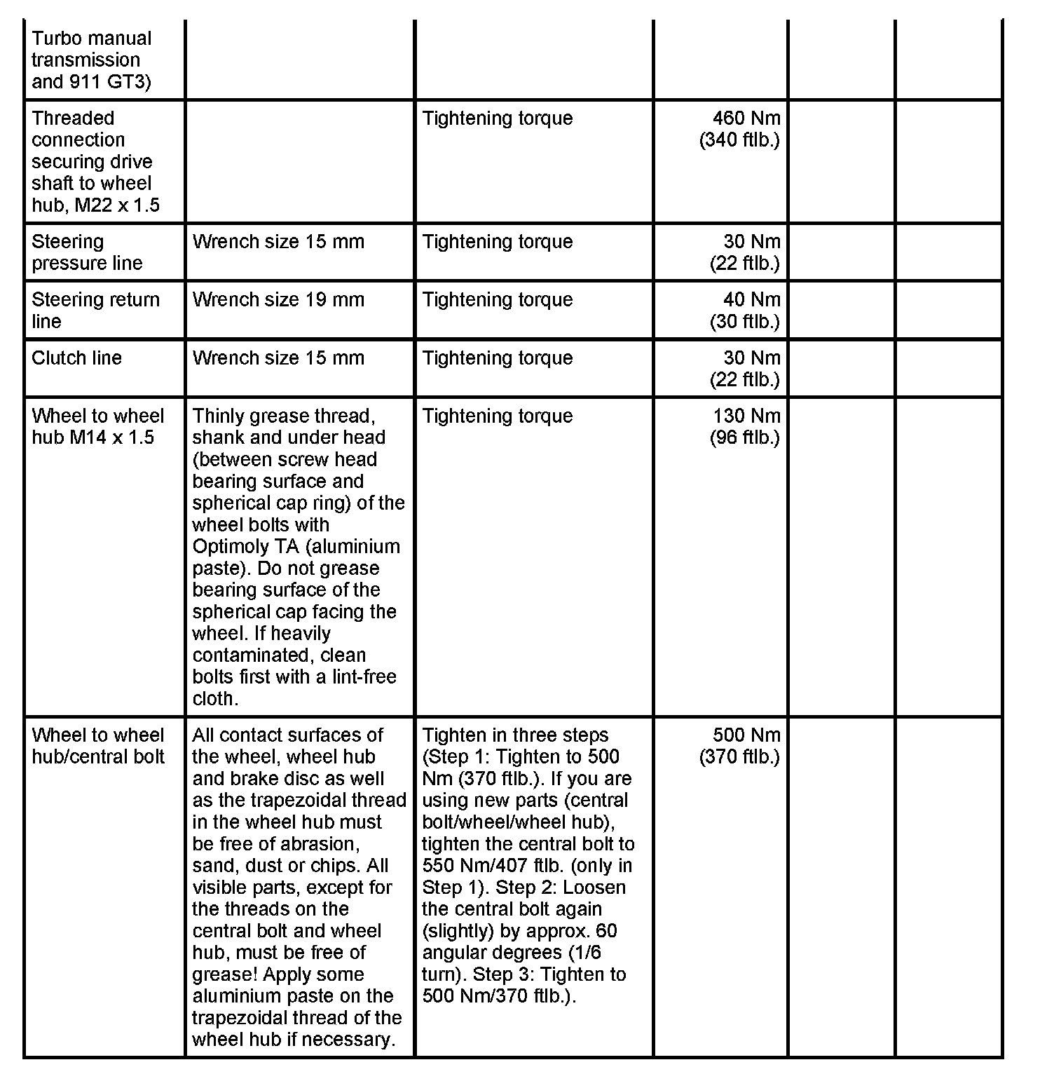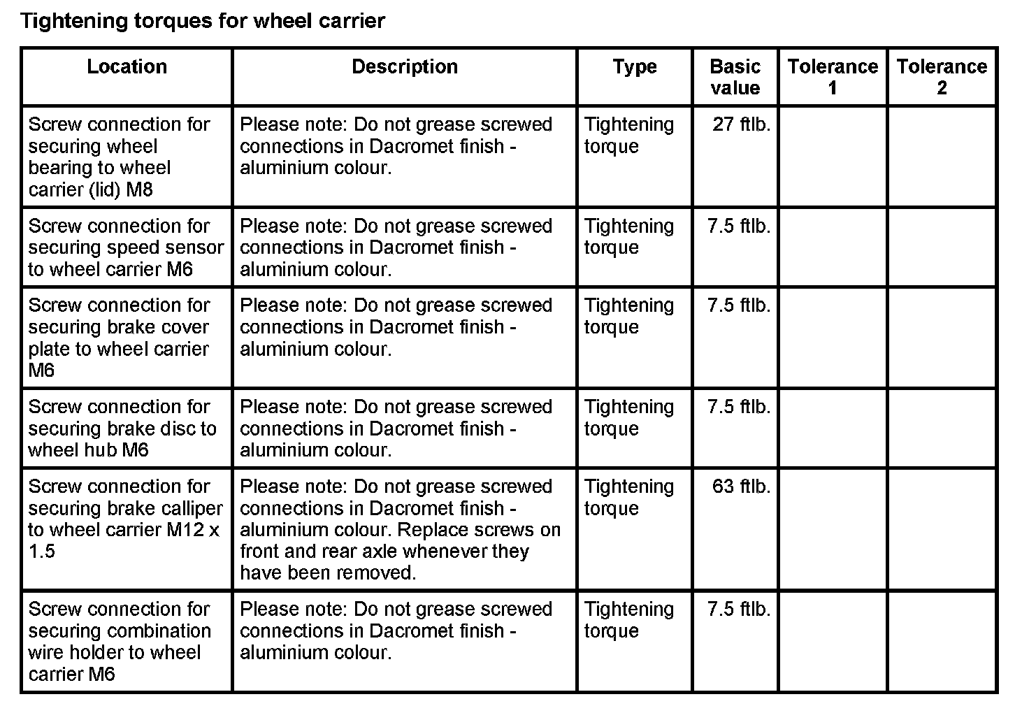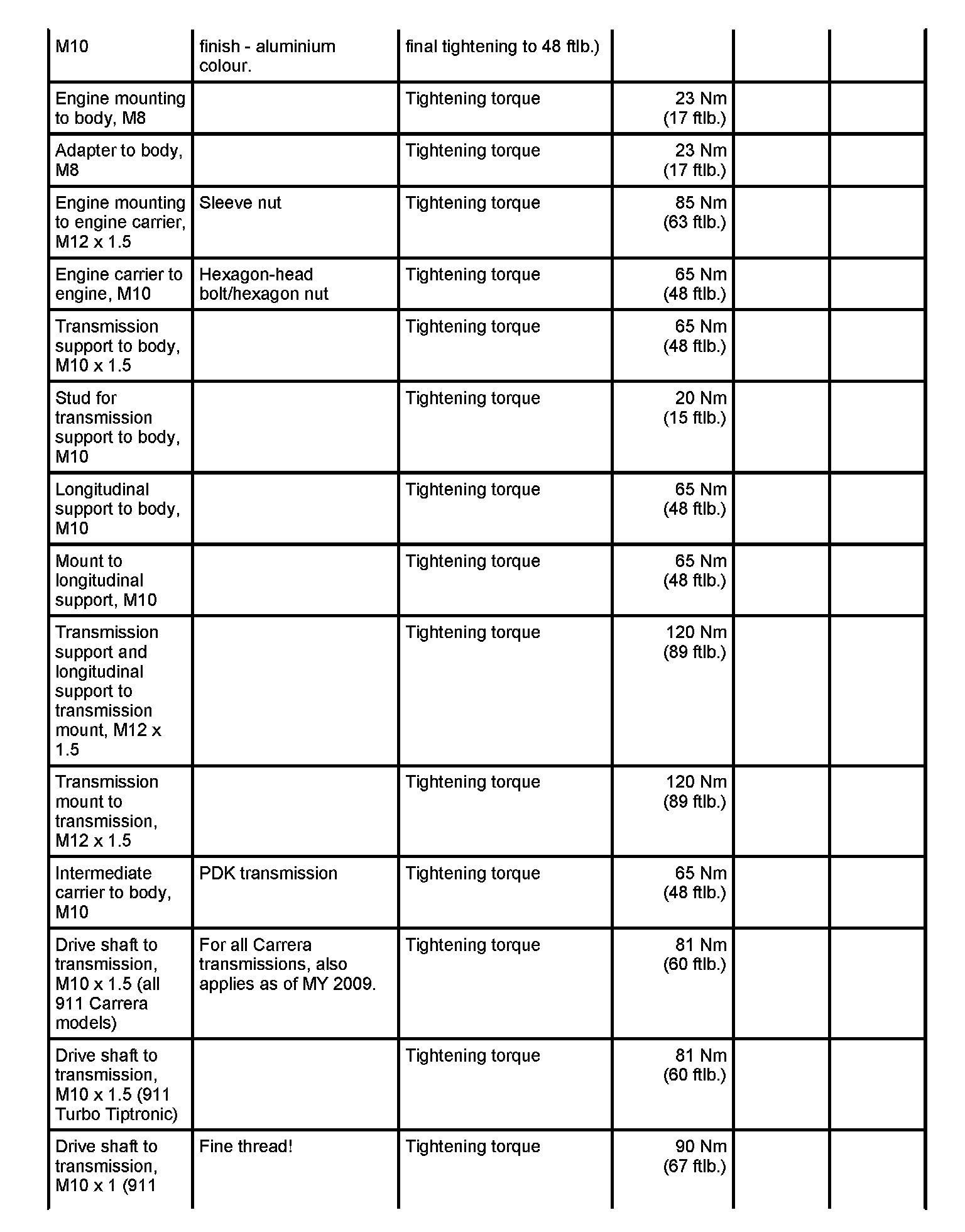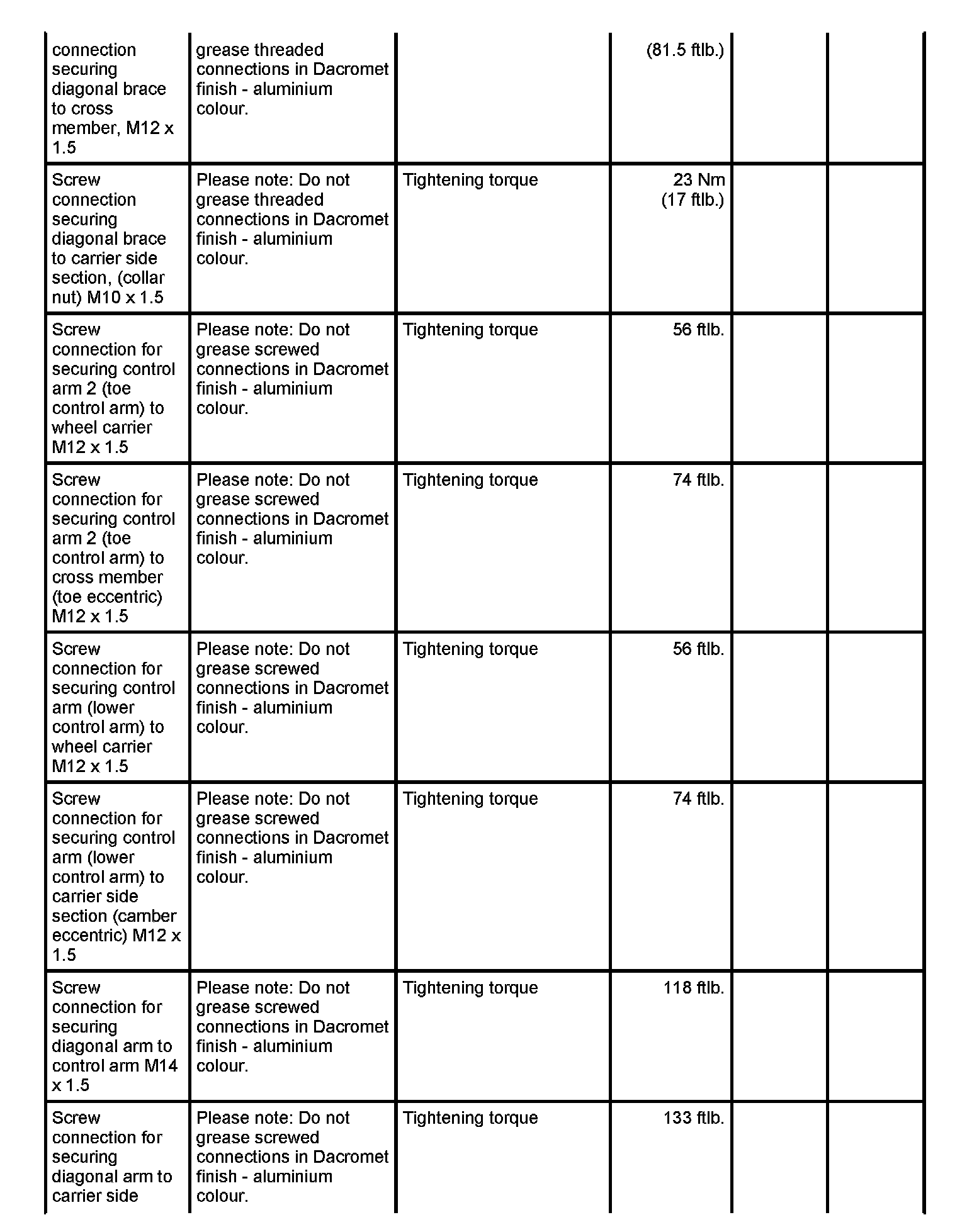 Tightening torques for rear axle