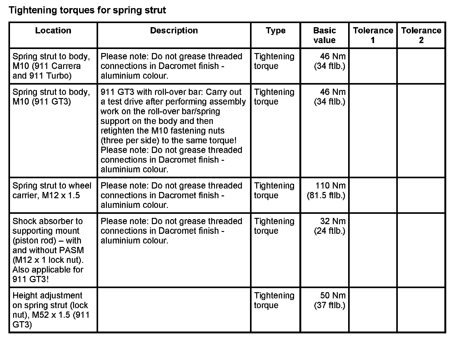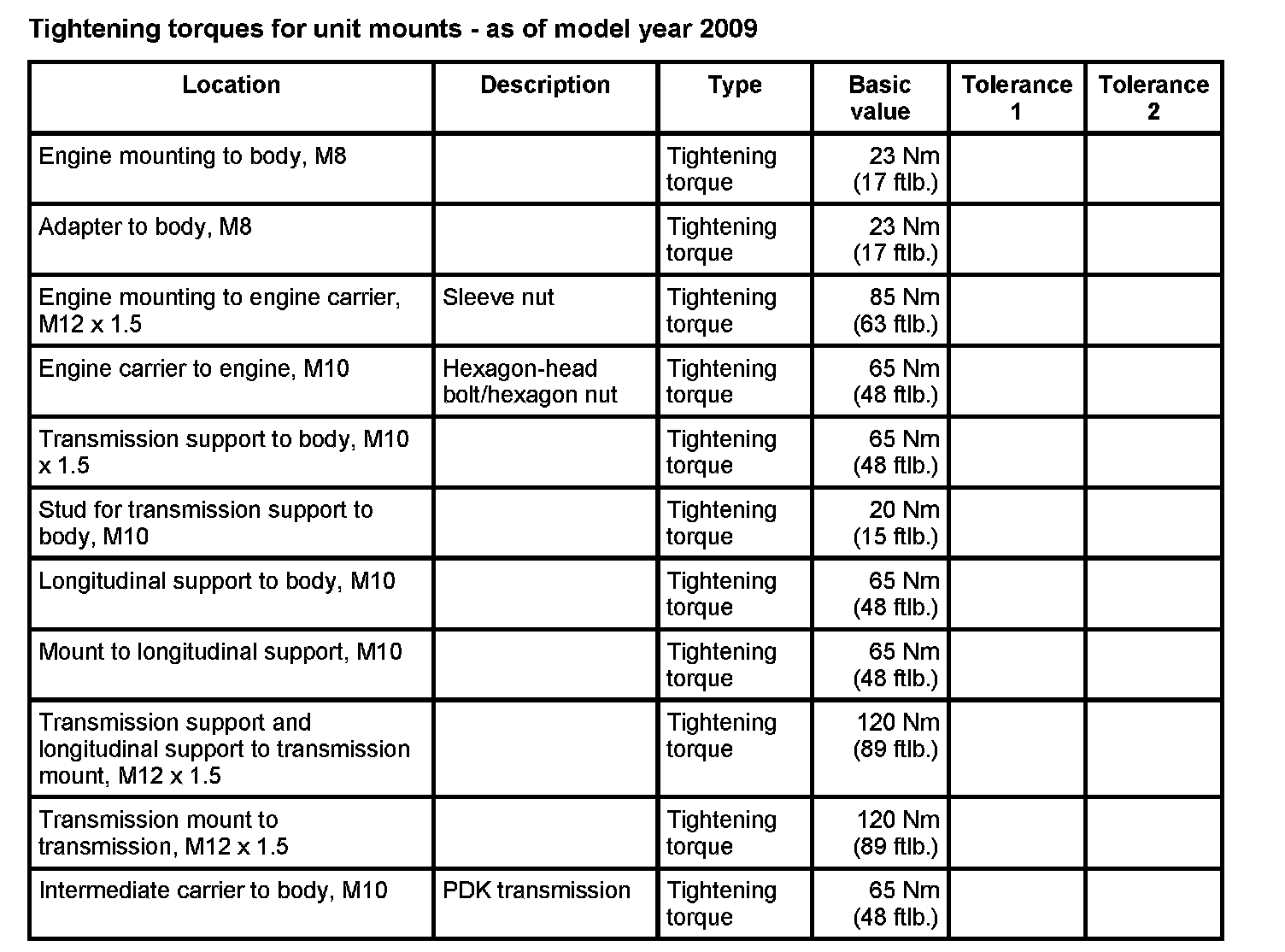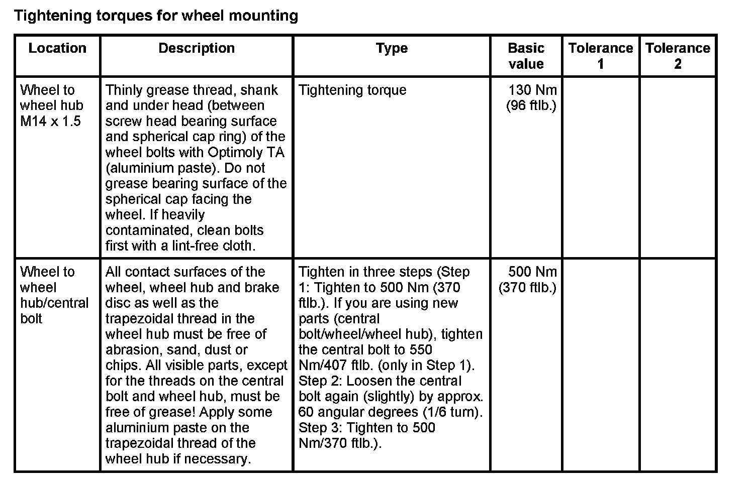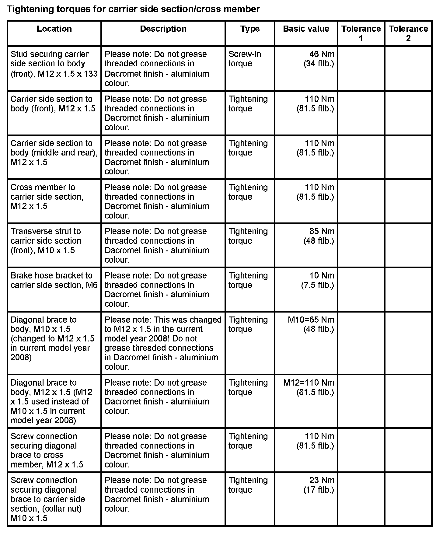Tightening torques for rear axle