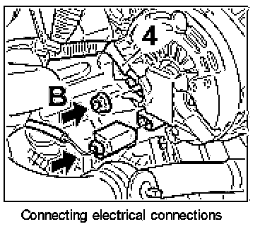 1. Place the three-phase generator on the engine and fit the B+ lead -4-, tightening with the fastening nut -B-. - Tightening torque: 11 ft.lb.