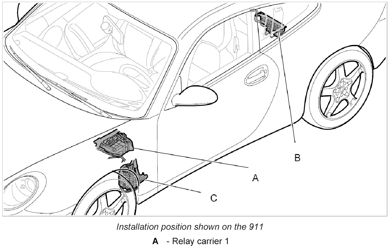 1. -A- Pull apart both retaining lugs on relay carrier support and press the relay carrier upward.