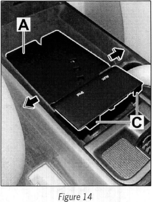 --> Carefully pull the center console apart in the area indicated by arrows (Figure 14) with the help of a second person.