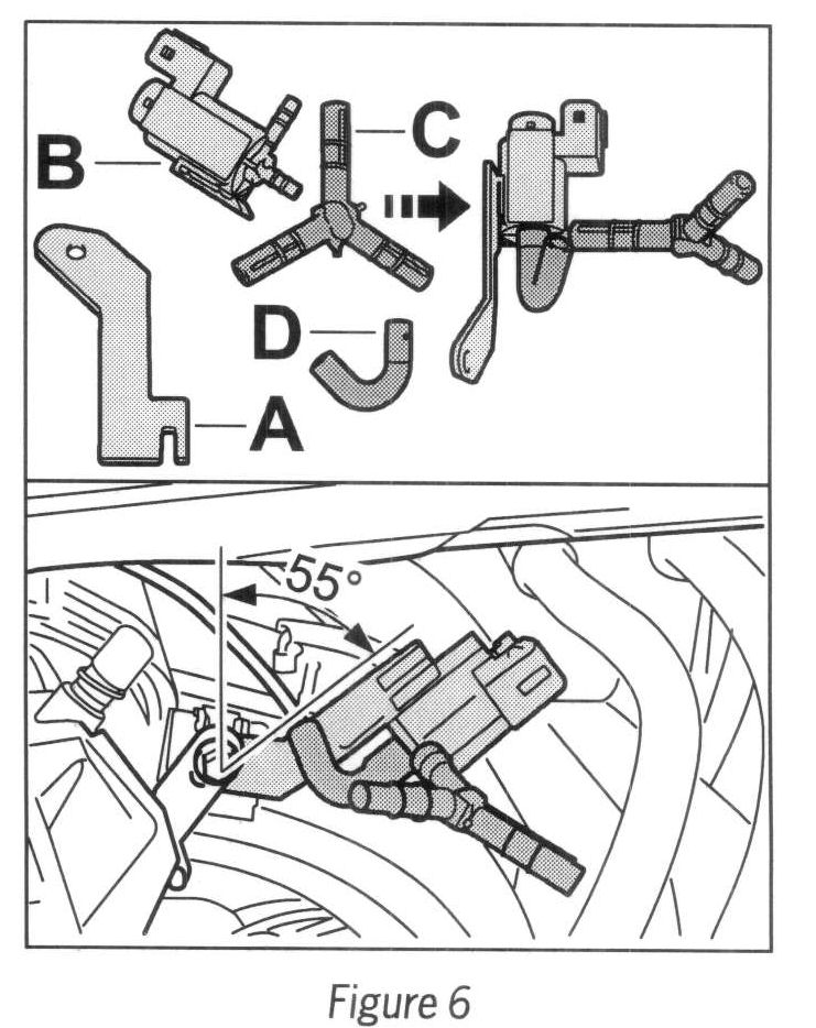 2.4 Position holder with changeover valve at an angle of approx. 550 and fit it and the reservoir support on the intake distributor for cylinders --> (--> Figure 6 -bottom-).