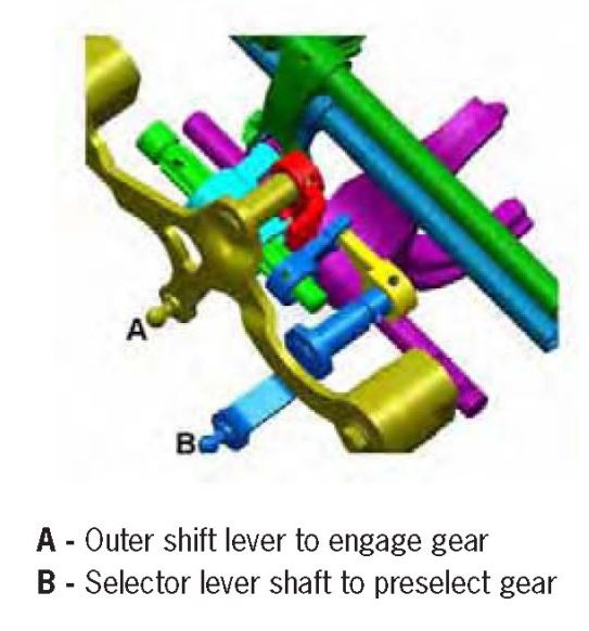 To allow preselection of the gear level, the selector cable is connected to the selector lever shaft (B). The shift cable is connected to the outer shift lever (A) to engage a gear.