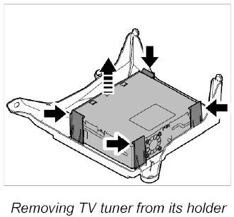 2. Lift the four lugs on the TV tuner aside and remove the TV tuner in an upward direction.
