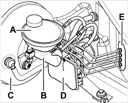 Remove hydraulic unit -D- together with the support and the four brake lines, which are fitted on the intermediate piece -E-.